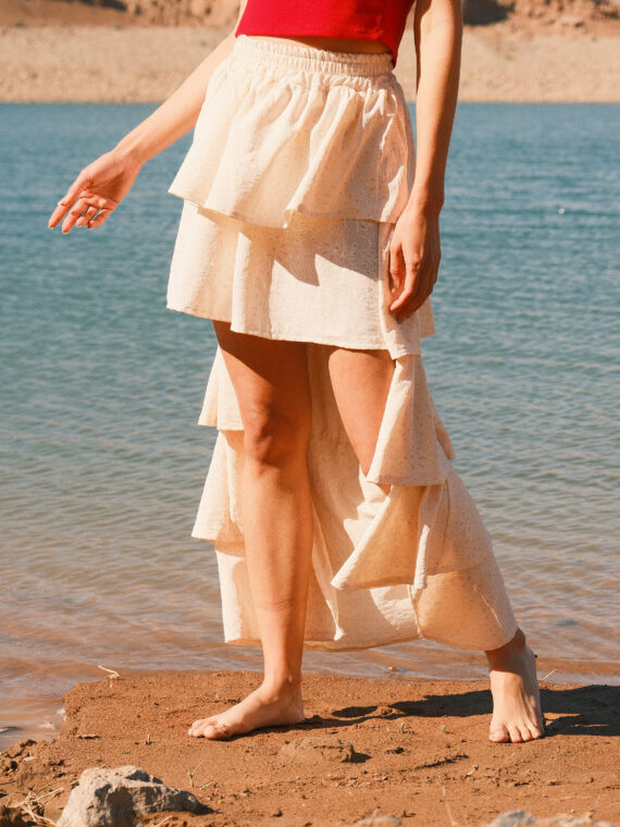 • Falda Meissa, una prenda que combina a la perfección el estilo moderno con la comodidad. Confeccionada en broderie, esta falda destaca por su corte asimétrico con bolados que realza la figura, brindando un look sofisticado y versátil. Ideal para combinar con blusas elegantes o camisetas casuales, permitiéndote crear looks para cualquier ocasión. Aporta un aire chic y contemporáneo a tu guardarropa, convirtiéndose en una pieza clave para lucir impecable en todo momento.